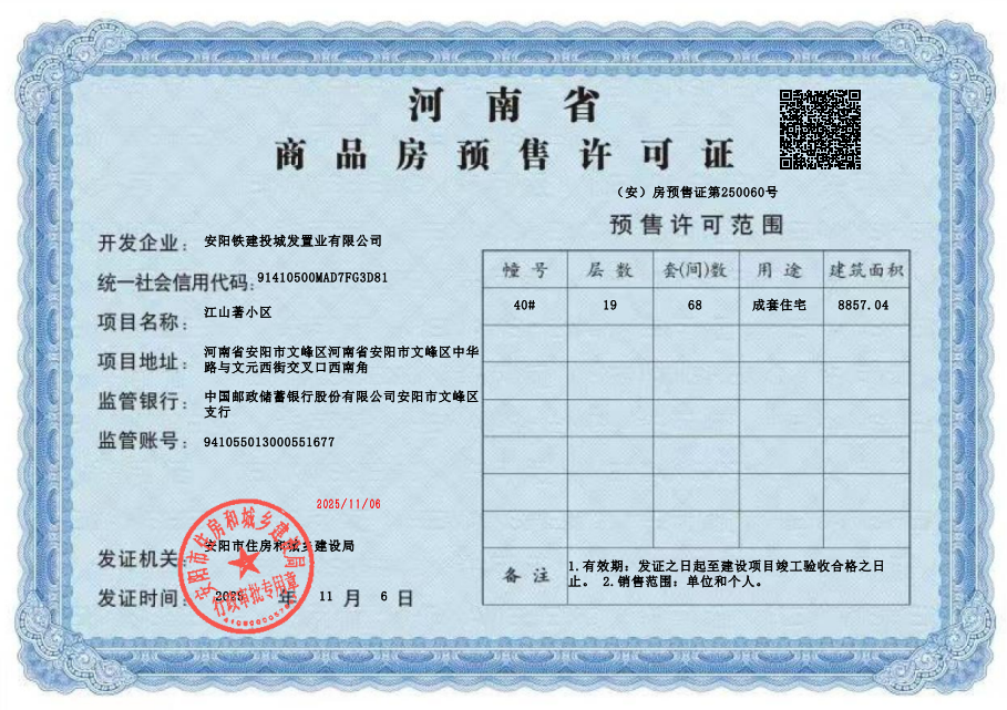 11月6日,铁建投城发·江山著项目40#楼取得《商品房预售许可证》。截至目前,项目一期所有楼栋已全部达到预售标准,为后续开发建设奠定坚实基础。