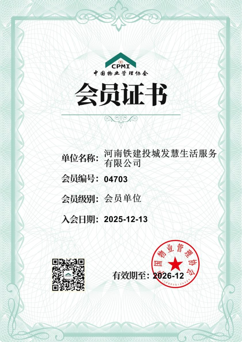 近日,铁建投城发集团旗下城市服务品牌——河南铁建投城发慧生活服务有限公司正式加入中国物业管理协会,成为该国家级行业协会的会员单位。这标志着城发集团城市服务板块在专业化、品牌化发展的道路上迈出关键一步,开启与全国优秀同行共促共进、持续提升服务品质的新征程。